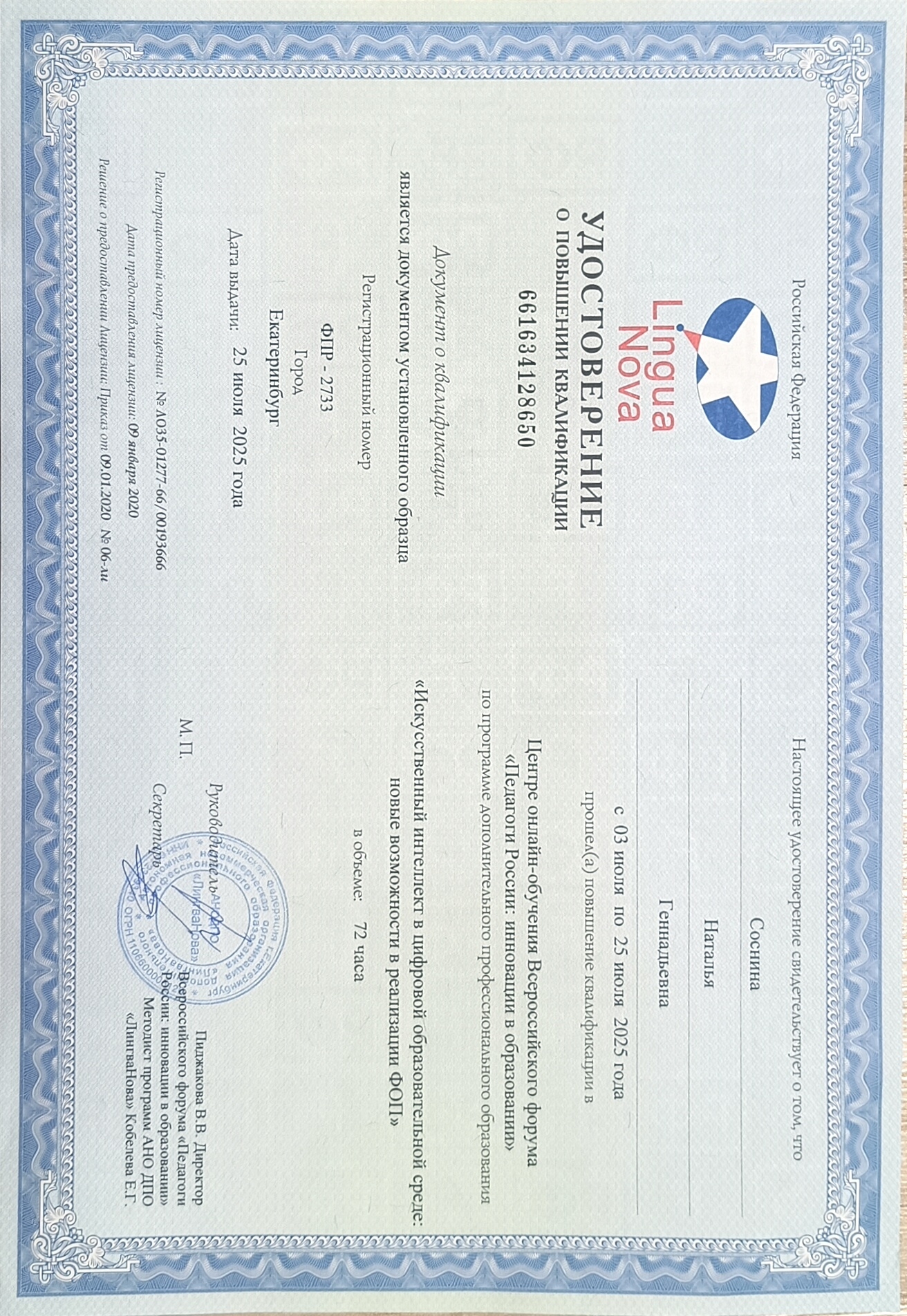 Удостоверение о повышении квалификации
